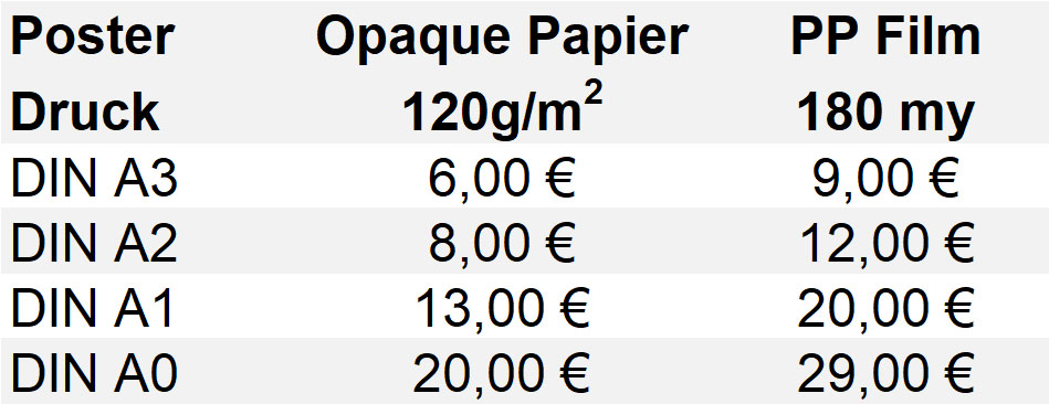 Großformat Ausdrucke bis DIN A0 innerhalb eines Tages auf verschiedenen Materialien. Von Foto-Glossy bis PVC-Plane bieten wir schnellen Service für Ihren Druck. Größere Formate benötigen 2-3 Tage Lieferzeit.